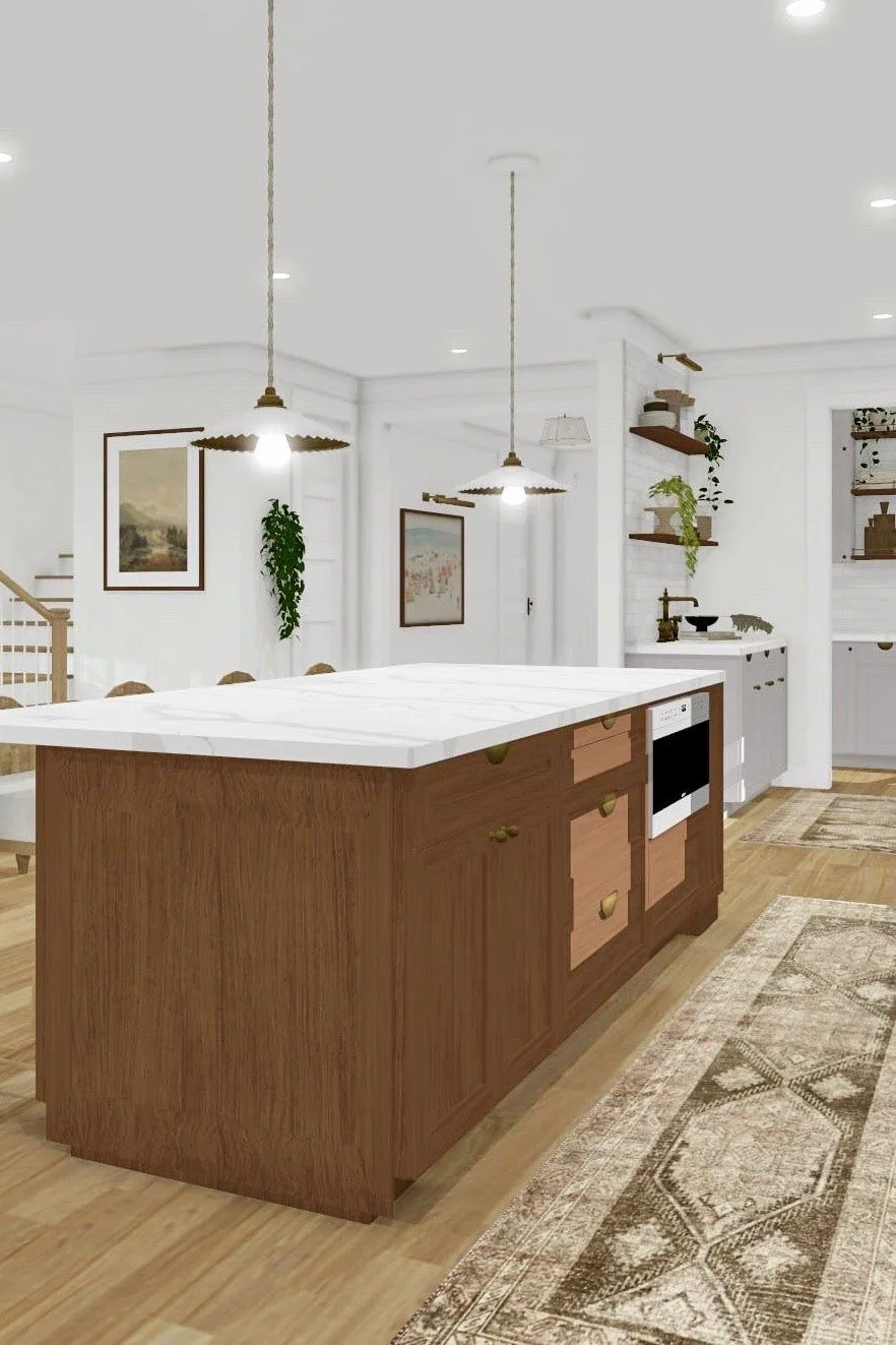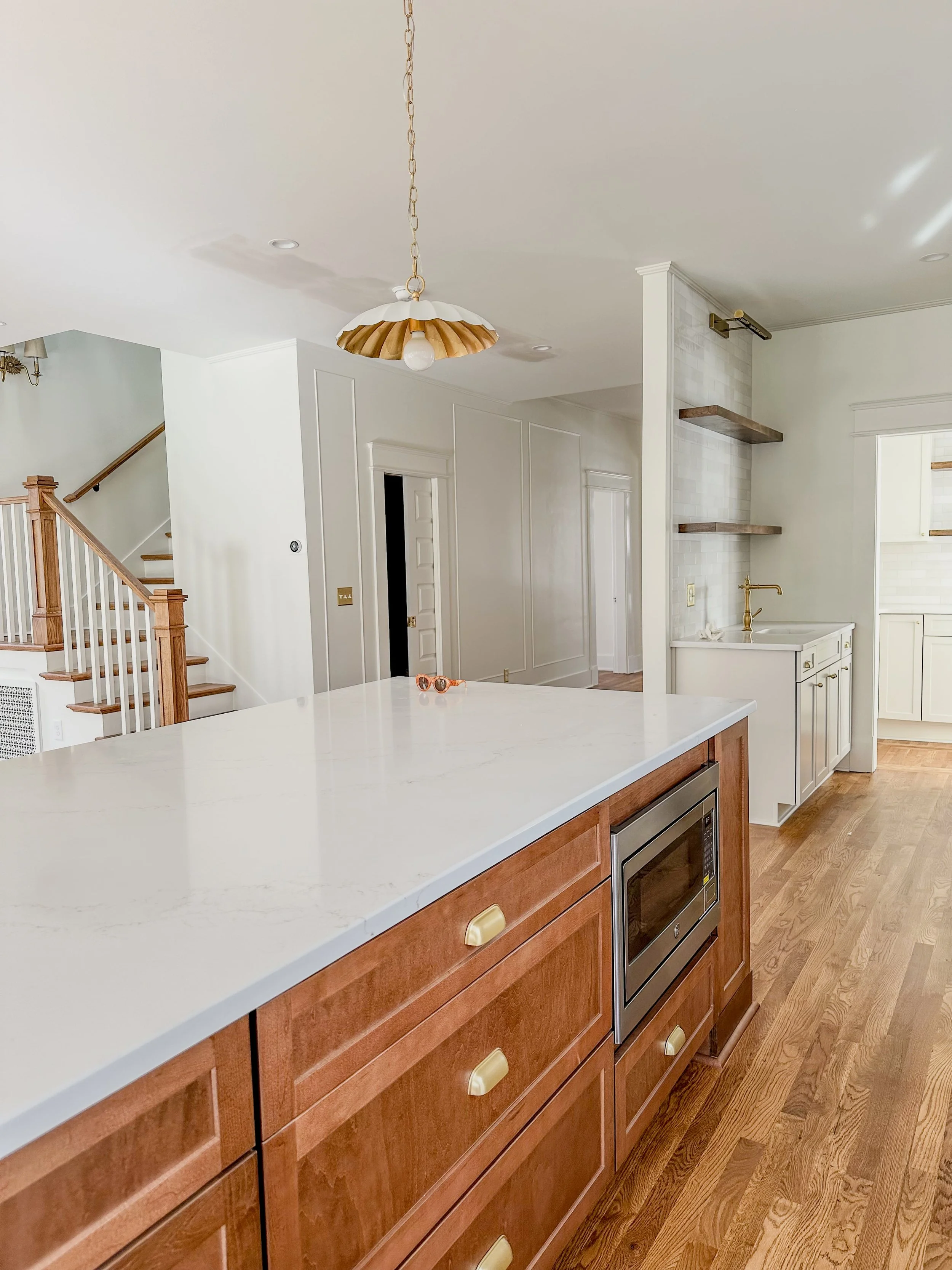 A kitchen with a large whitish marble island, wooden cabinets with gold handles, open shelves with a gold faucet sink, and a hanging light fixture. There is hardwood flooring and a staircase with wooden banisters in the background.