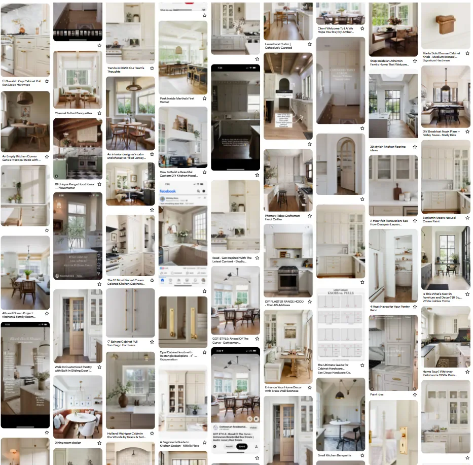Collage of various interior kitchen and dining room designs, including cabinetry, countertops, furniture, and decor.