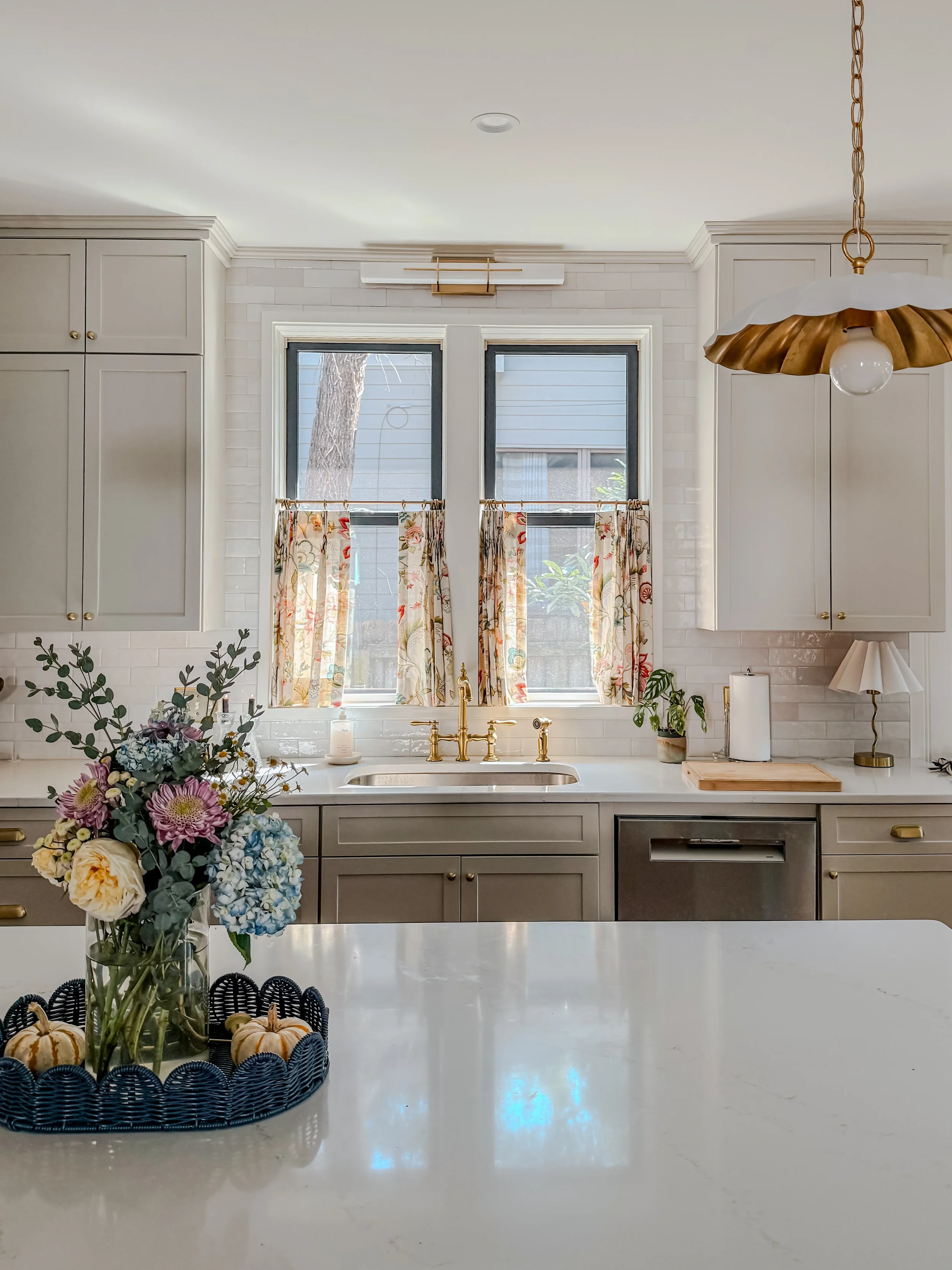 Kitchen with white cabinetry, a window with floral curtains, a white countertop with a vase of flowers and small decorative pumpkins, and a gold and white pendant light
