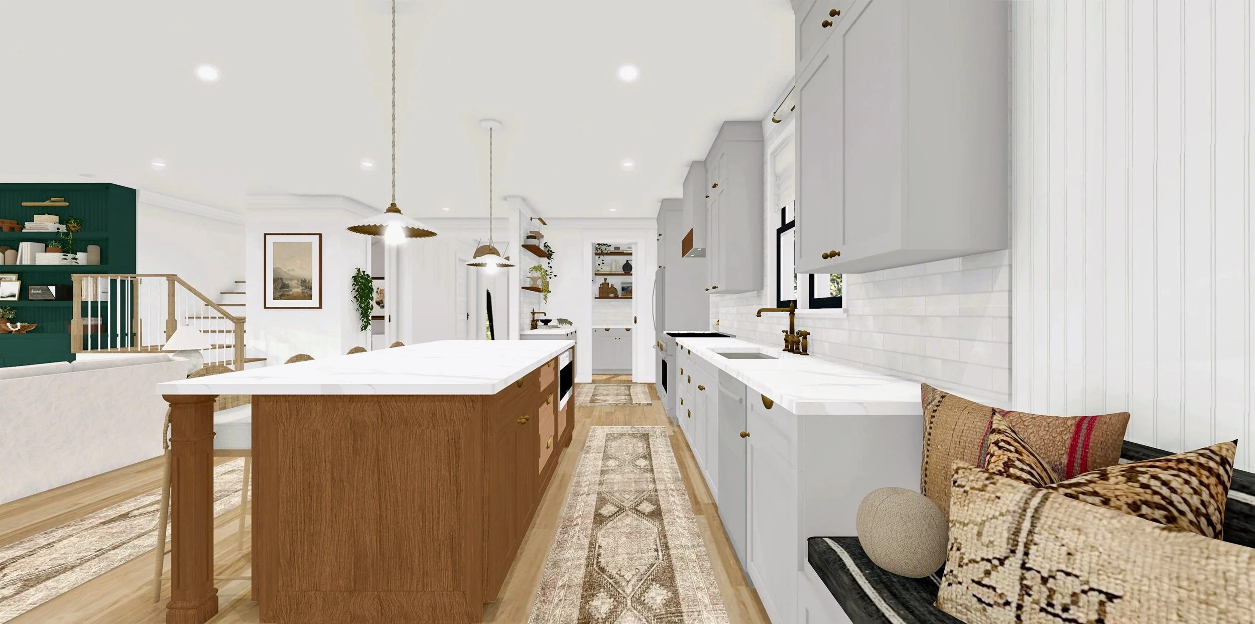 A modern open-concept kitchen with a large wooden island, white countertops, and brass pendant lighting, featuring white walls, wooden flooring, and floating shelves with decor.