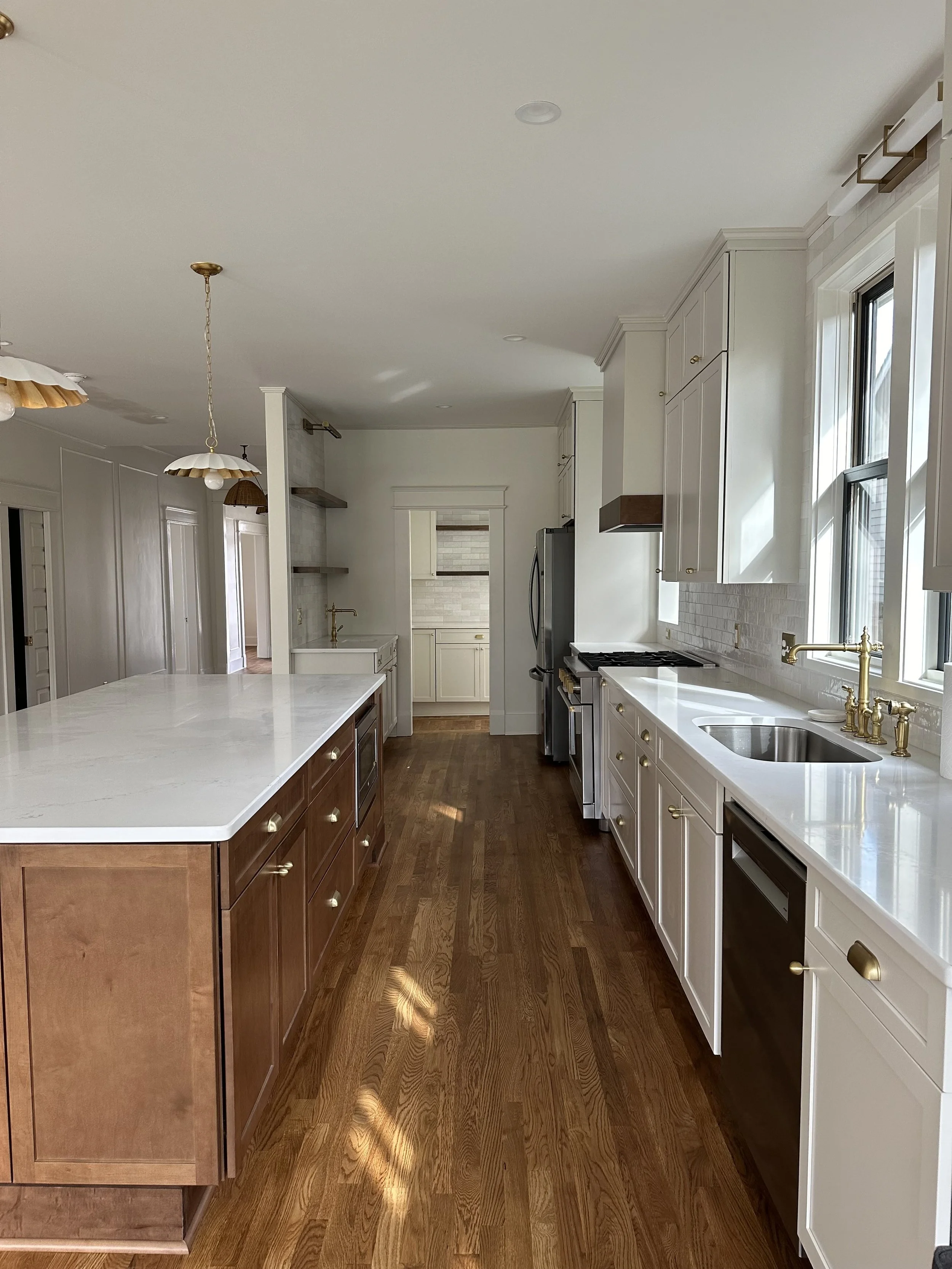 Bright modern kitchen with white cabinets, a large island with a wooden base, and hardwood flooring. The kitchen features gold hardware on the cabinets, a double sink under windows, and stainless steel appliances. Natural light streams in through the windows.